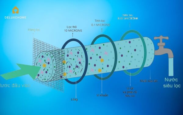 • Ưu điểm: Hiệu quả lọc cao, loại bỏ đến 99% các tạp chất, bao gồm các hạt vi nhựa và chất độc hại. Nước sau khi lọc tinh khiết, an toàn để uống trực tiếp.