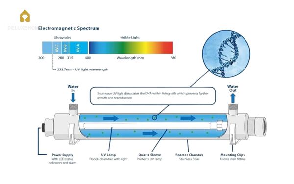 Công nghệ UV là sự lựa chọn hoàn hảo cho việc diệt khuẩn trong nước mà không cần đến hóa chất. Hệ thống UV loại bỏ các vi sinh vật gây bệnh mà không làm thay đổi chất lượng nước, không có tác động hóa học và không để lại mùi khó chịu.