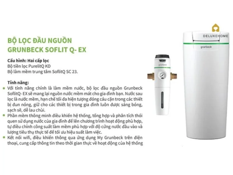 • Bộ làm mềm trung tâm SoflitQ SC - 23: nhiệm vụ là trao đổi ion ngược dòng, một bản quyền đặc trưng trong hệ thống máy lọc của Đức, giúp giảm tình trạng nước cứng, vôi hóa, canxi hóa cũng như bảo vệ tuổi thọ các thiết bị vệ sinh và giảm tình trạng ố vàng do nước gây ra. Sự thông minh của thiết bị này là khả năng tự điều chỉnh công suất hoạt động dựa trên nhu cầu sử dụng nước và thành phần trong nước để lọc nước hiệu quả.