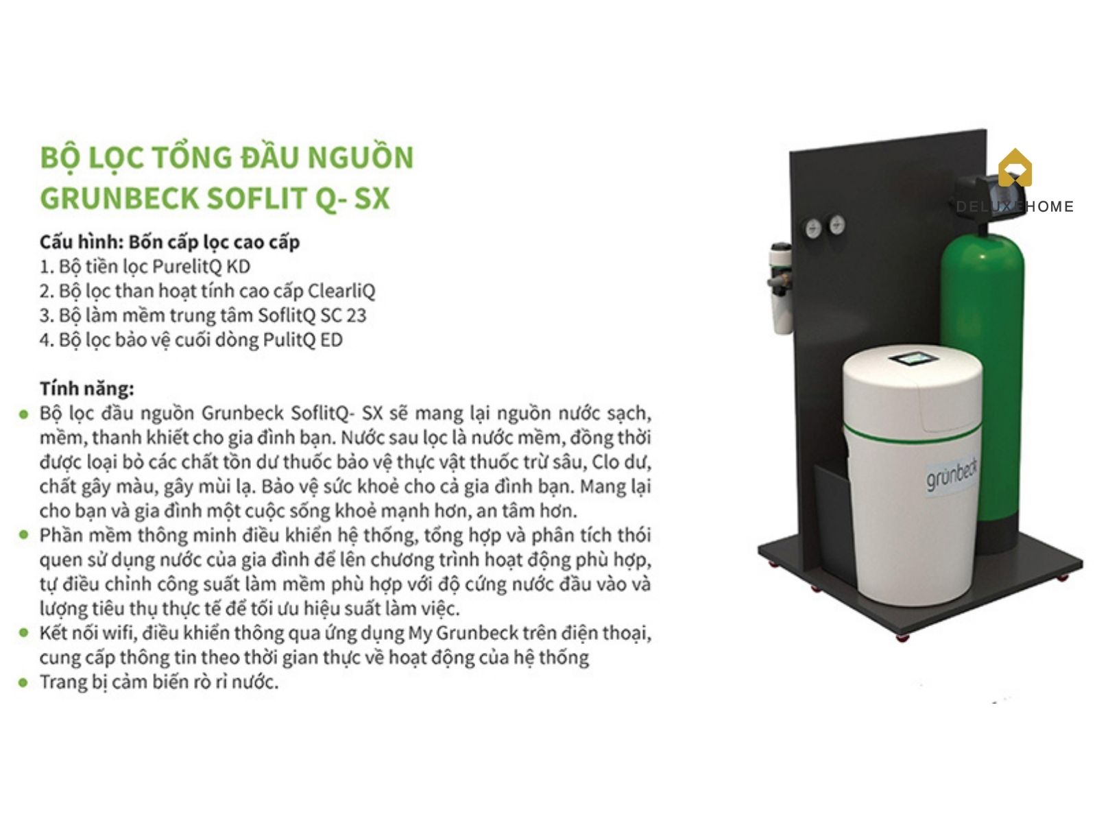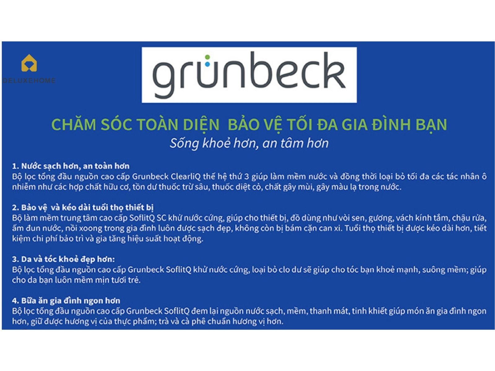 • Hệ thống lọc nước tổng Grunbeck (Germany) thế hệ mới giúp loại bỏ tối đa các tác nhân ô nhiễm, thuốc trừ sâu thuốc diệt cỏ là thành phần hàng đầu gây ung thư cũng được khử sạch.